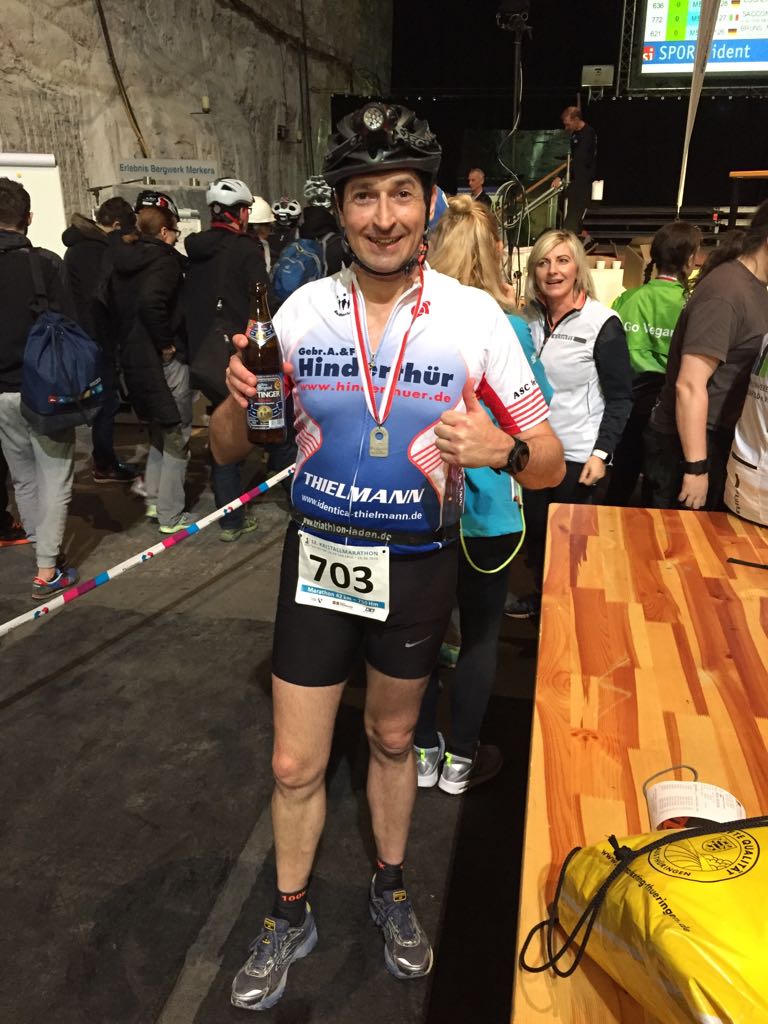 Nach zwei Wochen Virus Infektion ging es für Carsten nach dem Testlauf in Niederfischbach auf direktem Wege nach Thüringen. Hier nahm er am 18.02.2018 am 12. Kristallmarathon im Erlebnisbergwerk Merkers teil. In 500 m Tiefe wurden bei angenehmen 21 Grad rund 160 Läuferinnen und Läufer auf die Marathonstrecke geschickt. Mit Halbmarathonis und 10 km Startern war das Feld aus max. 500 Personen begrenzt. Nicht zu unterschätzen sind die klimatischen Bedingungen in einem Bergwerk, laufen mit Helm und Stirnlampe und die insgesamt 750 Höhenmeter die zu überwinden waren. Für Carsten galt es nur im Zeitlimit zu bleiben, aber selbst das wurde ein harter Weg. Nach 5:25.07 Stunden blieb die Uhr stehen.
