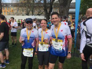 Bei bestem Laufwetter und getragen von ca. einer halben Million begeisterten Zuschauern entlang der Strecke vorbei am Brandenburger Tor und der Siegessäule, am Schloss Charlottenburg, entlang über den Kurfürstendamm und den Potsdamer Platz erreichte ich das Ziel nahe des Fernsehturms auf der Karl-Marx-Allee in 1:43:52 Std. und war damit fast eine Minute schneller als im Vorjahr. Während ich in 2017 mit der Medaille um den Hals vor Kraftlosigkeit fast umgefallen wäre, ging’s mir diesmal richtig gut im Ziel und ich hätte nach einer kleinen Pause sofort noch weiterlaufen können. Die Basis dafür wurde doch im Winter an vielen Sonntagen mit langen Läufen gelegt.