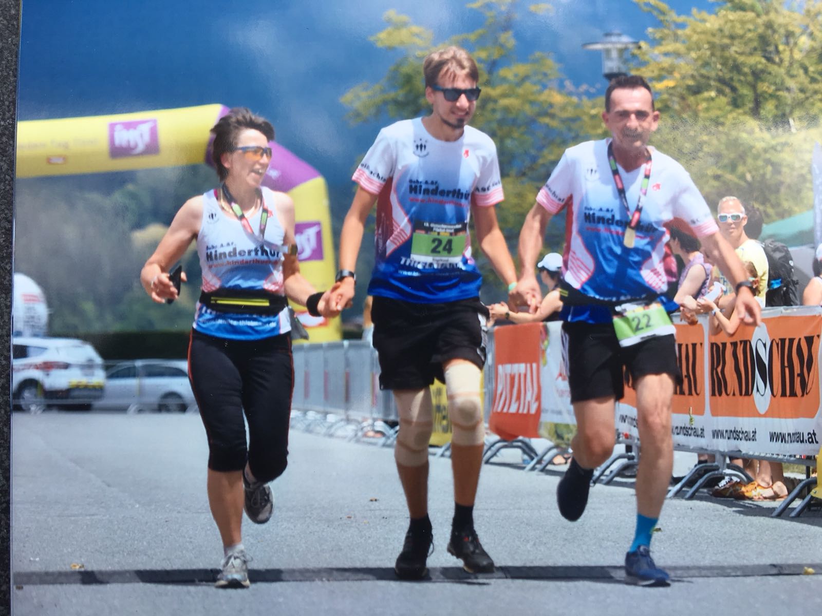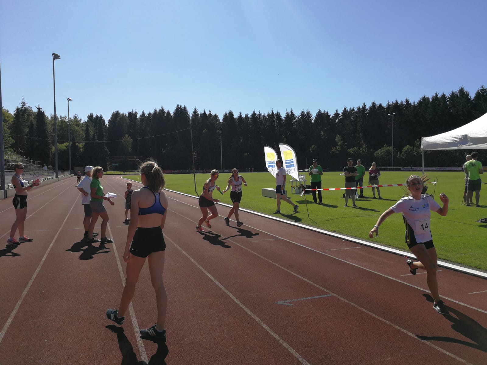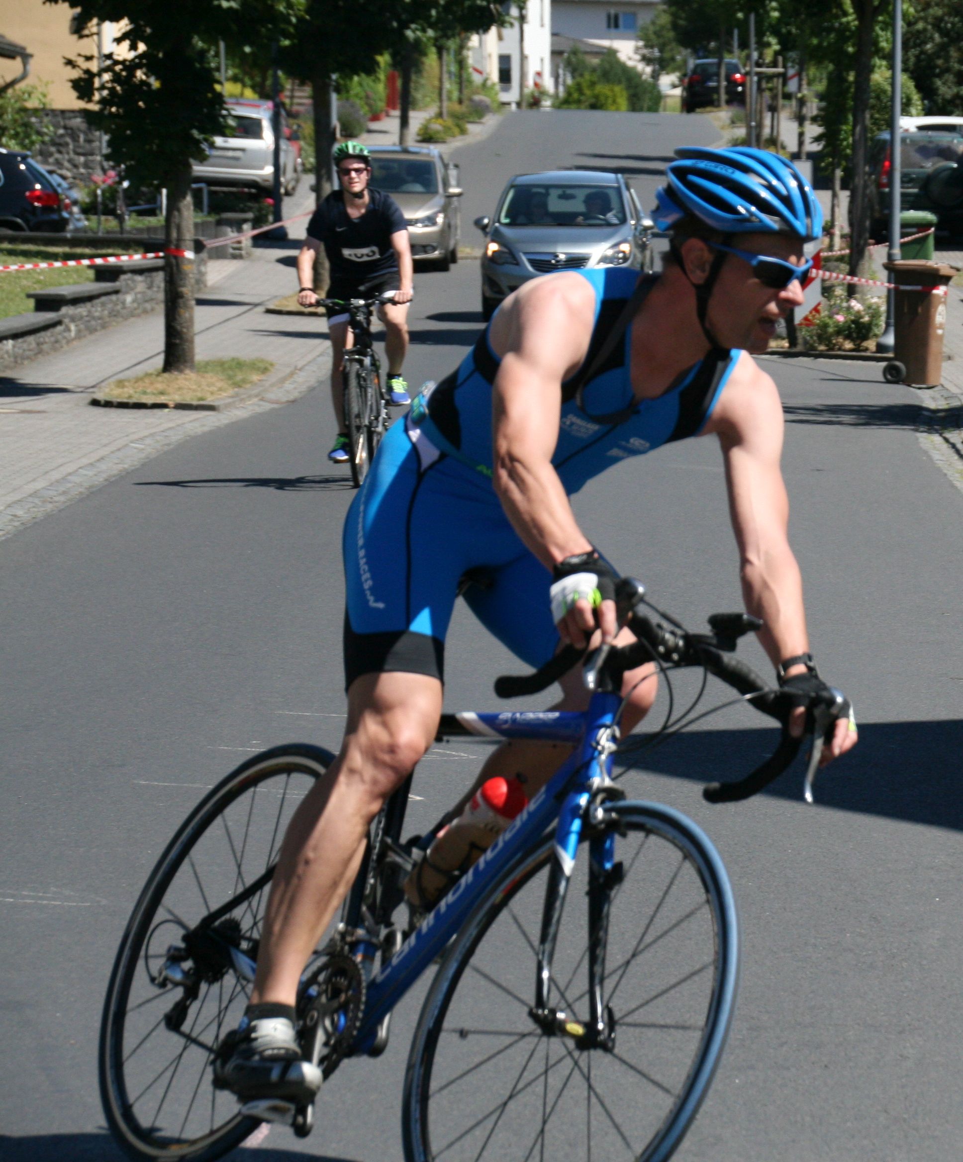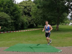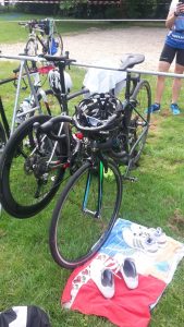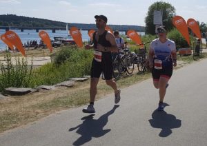 Nach Verlassen des Wassers ging es nach einem kurzen Sprint bergauf in die Wechselzone um sodann auf den Radrundkurs zu wechseln. Dieser war mit einer Länge von 20 km ausgeschrieben, was aber schon in der Wettkampfbesprechung auf 23 km korrigiert wurde. Die Strecke lag überwiegend im Schatten, was bei den Temperaturen äußerst angenehm war. Die 5 km lange Laufstrecke lag – anders als die Radstrecke – vollständig in der Sonne, so dass die hohen Temperaturen hier deutlich spürbar waren. Die Strecke war nicht vollständig gesperrt, so dass hier teilweise um Fußgänger „Slalom“ gelaufen werden musste. Aber gerade im Bereich der zweimal zu überlaufenden Fußgängerbrücke quer über den See ließ sich der eine oder andere Ausflügler zu Motivationsrufen hinreißen.