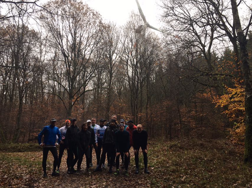 Was kann man an einem grauen und regnerischen Novembertag Besseres machen, als gemeinsam laufen? Diese Frage stellte sich unserer Gruppe nicht wirklich. Den Wetterverhältnissen angepasst gekleidet ging es heute Richtung Kalteiche. Als wir in etwa auf halber Höhe die Flügel des ersten Windrades hinter den Bäumen aus dem Dunst erblickten gab es einen kurzen Stopp. Wir stellten uns zum Gruppenfoto auf, welches qualitativ gut zu dem Novemberwetter passt.